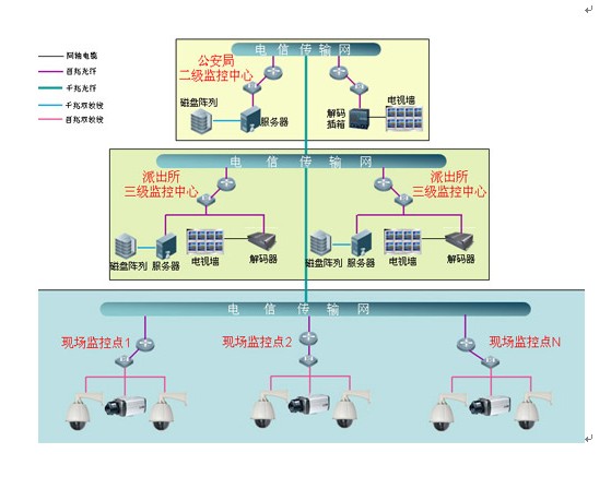 區公安局二級監控中心通過1000M光纖接入城市報警與監控系統專用傳輸網絡,派出所三級監控中心通過100M光纖接入城市報警與監控系統專用傳輸網絡,前端采集點通過光纖接入。整個系統采用二級結構即設置兩級監控中心,區公安局設二級監控中心,派出所設置N個三級監控中心,儲存方式采用分散儲存,所有的圖形信息儲存在派出所三級監控中心,區公安局二級監控中心通過管理權限調用相應的重要圖像和數據信息。 |