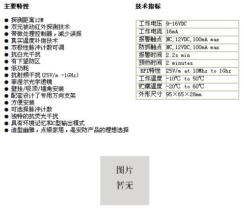 具有信號捕捉能力強,誤報、漏報率低,低功耗和真實溫度補償的特點。產品技術含量高、制作工藝考究、外觀造型高雅,而且性能穩定,使用壽命期長。特殊的透鏡設計,無下視死角,既可墻掛式也可吸頂式安裝。配合RG93安裝支架會更加方便地施工和安裝